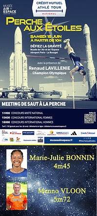 Cap sur l’infini et au-delà ! Pour cette édition hors du commun, les perchistes ont quitté le gymnase pour s’élancer sur le tarmac mythique de l’aéroport du Bourget, au cœur du Musée de l’Air et de l’Espace, face aux imposantes fusées Ariane. Dans cette ambiance cosmique, le Néerlandais Menno Vloon décolle à 5m72 pour décrocher la victoire. Chez les féminines, Marie-Julie Bonnin s’élève à 4m45 et brille au firmament de cette édition.